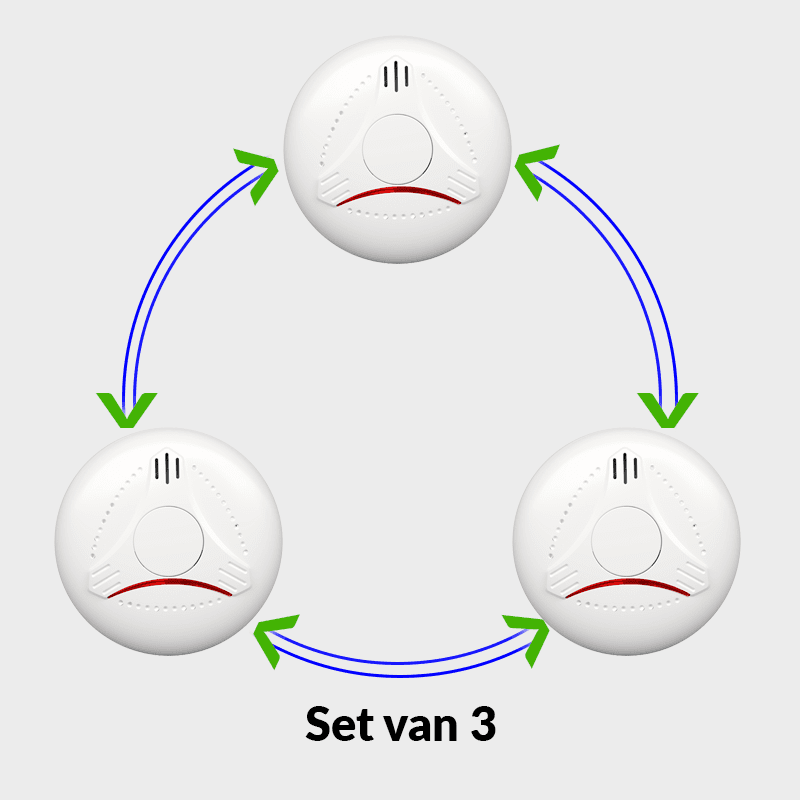Heeft u een Rookmelder set van 3 stuks koppelbaar dan gaan alle rookmelders die gekoppeld zijn direct een brandmelding geven.